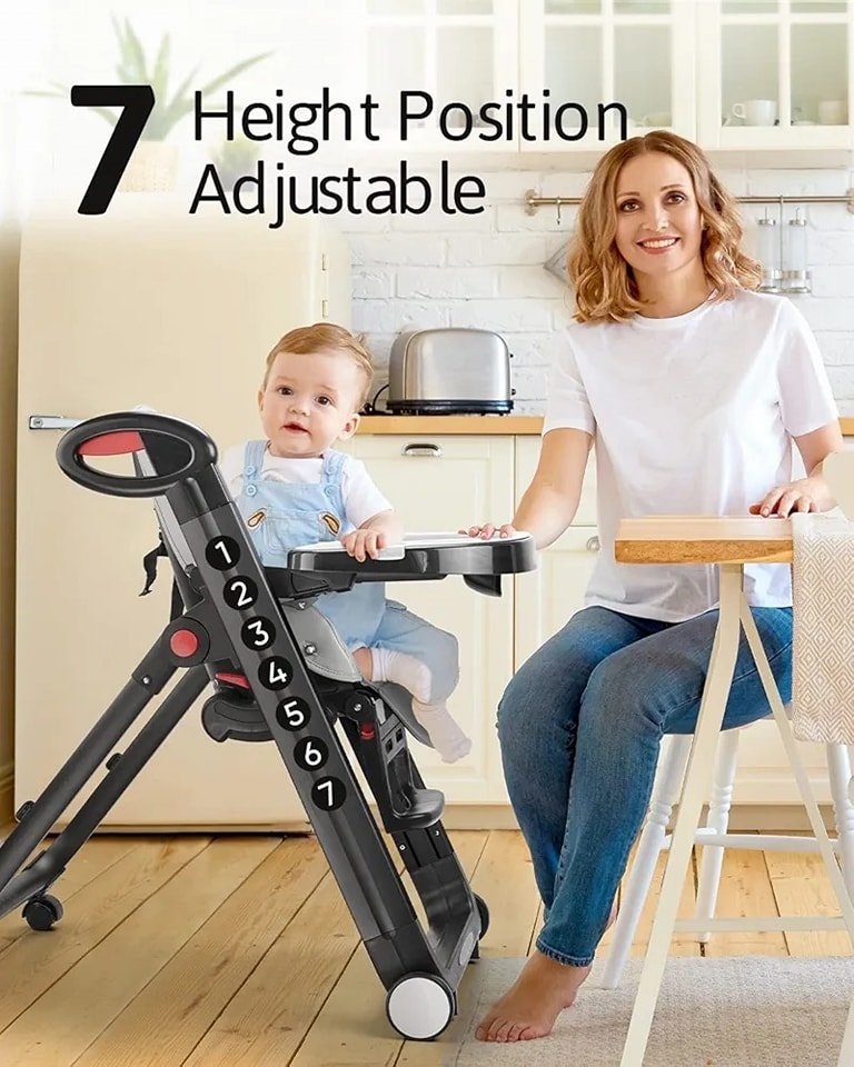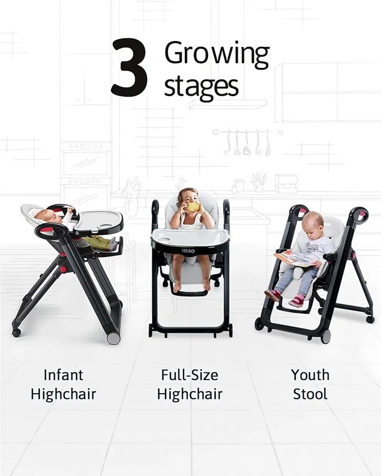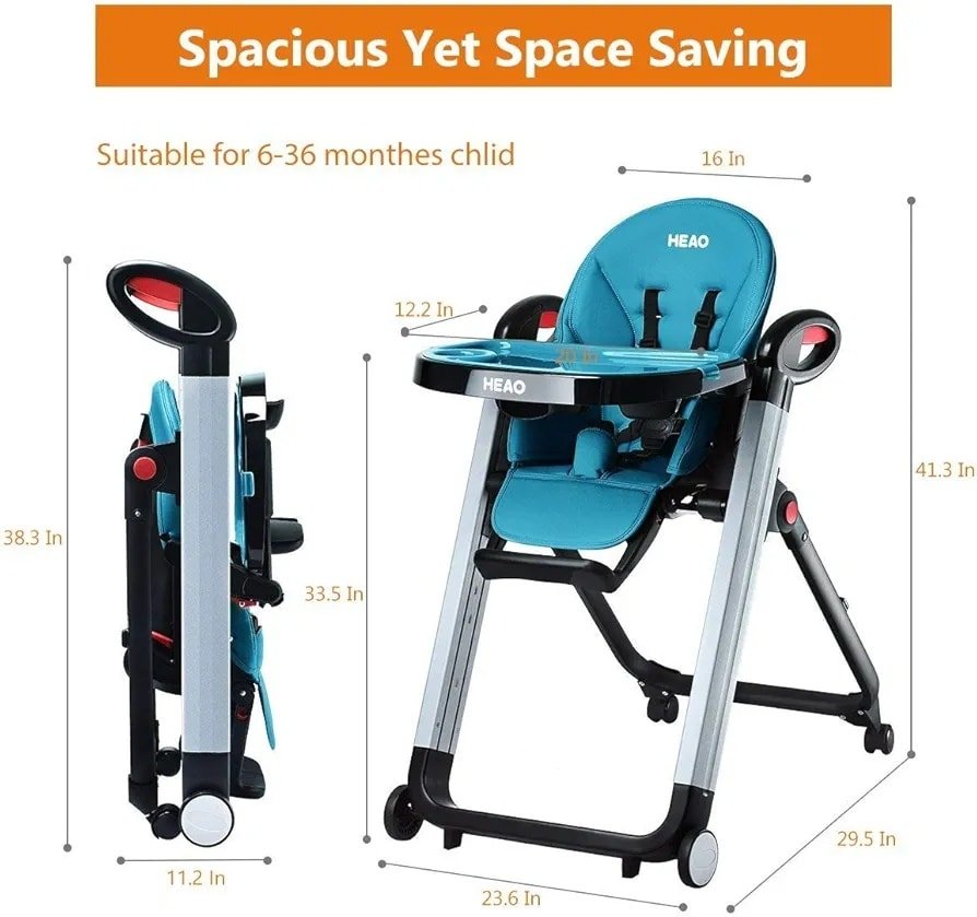 The HEAO Foldable High Chair is a multi-functional baby chair designed for comfort, safety, and portability. It features an adjustable recline for resting, height-adjustable seating for growing babies, and four smooth-rolling wheels for easy movement. The foldable design allows for convenient storage, making it ideal for home or travel use.