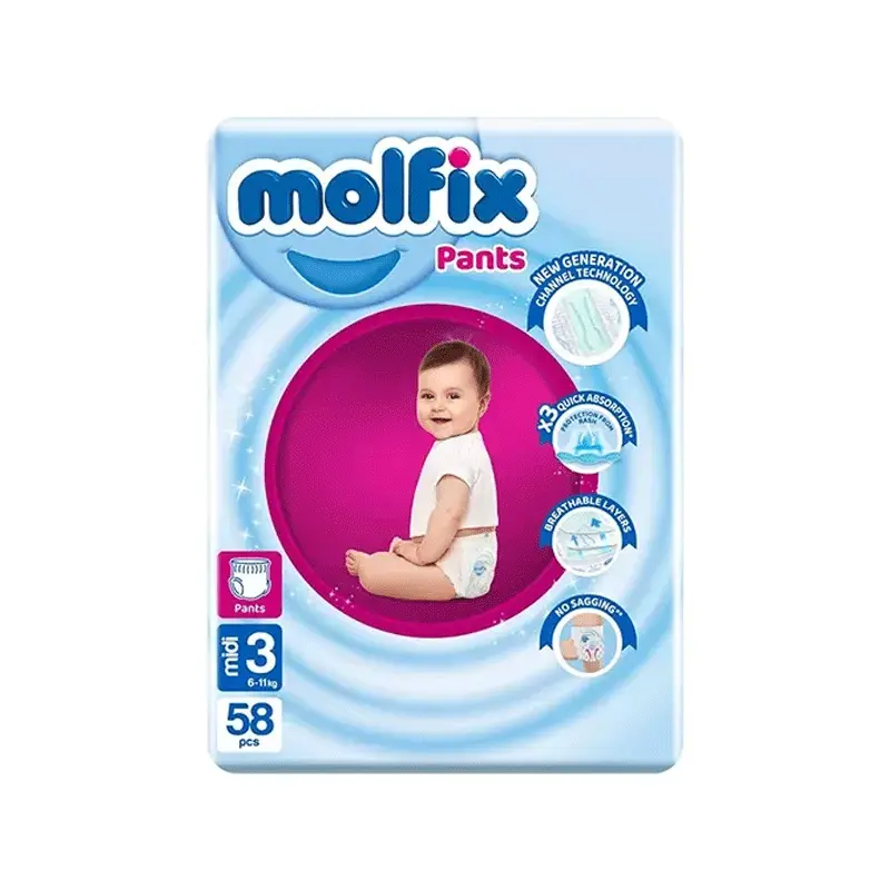 Molfix Pants Midi 3-58 pcs is specially designed for babies weighing 6–11 kg. These pant-style diapers combine comfort, dryness, and flexibility to keep your baby active and happy all day.