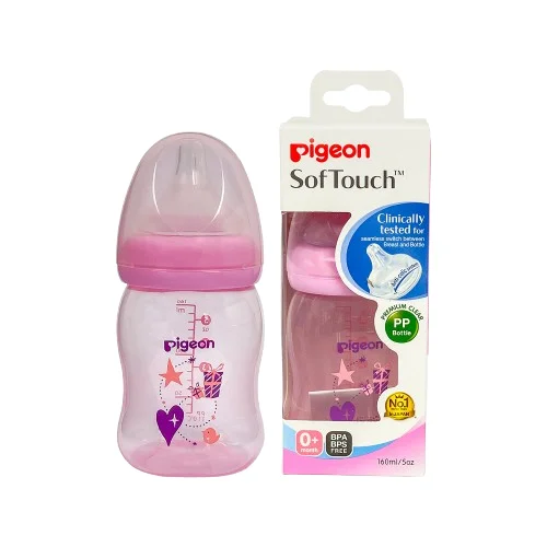 SofTouch PP Baby Feeding Bottle by Pigeon (160 ml, 0m+) is designed to offer newborns a natural, comfortable feeding experience. The SofTouch Peristaltic PLUS nipple, made from 100% soft silicone, allows babies to mimic natural tongue movements for smooth feeding — just like breastfeeding. The wide-neck design ensures easy filling and cleaning, while the built-in Air Ventilation System (AVS) helps reduce colic by preventing air intake and supporting a constant milk flow. Made from BPA-free polypropylene, this bottle combines safety, hygiene, and functionality for everyday use.