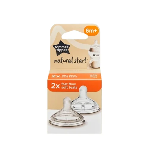 Attach the Fast Flow teat securely to a Tommee Tippee Natural Start bottle. Fill the bottle with milk or formula at the right temperature. Feed your baby in a semi-upright position to ensure smooth flow and reduce air intake.